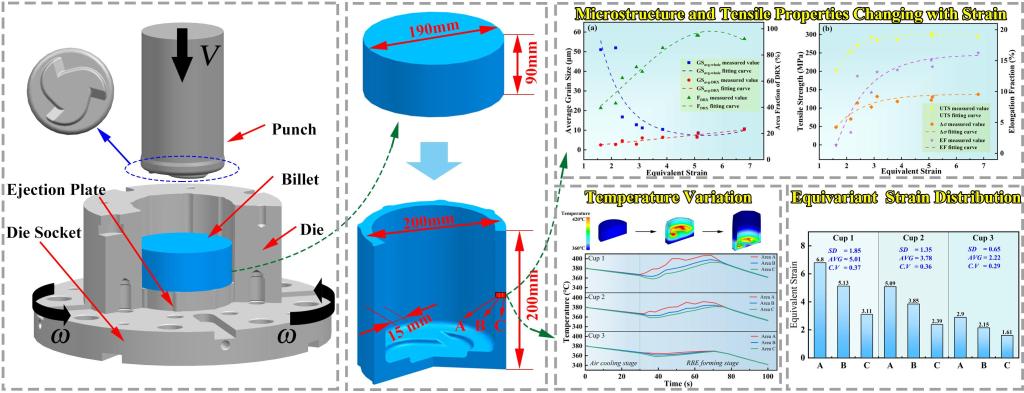 张治民教授团队,针对航空航天和国防军工装备用轻合金舱体各向异性大的痛点,提出了旋转挤压成形新技术,有限元模拟结合物理实验,精确设计与控制成形件的温度场及应变场,在自主研发的国内外首台多向加载旋转挤压机上,加工出弱各向异性镁合金舱体。成果报道于制造领域顶刊《Journal of Materials Processing Technology》(链接://doi.org/10.1016/j.jmatprotec.2023.118081)。我校大奶做爱