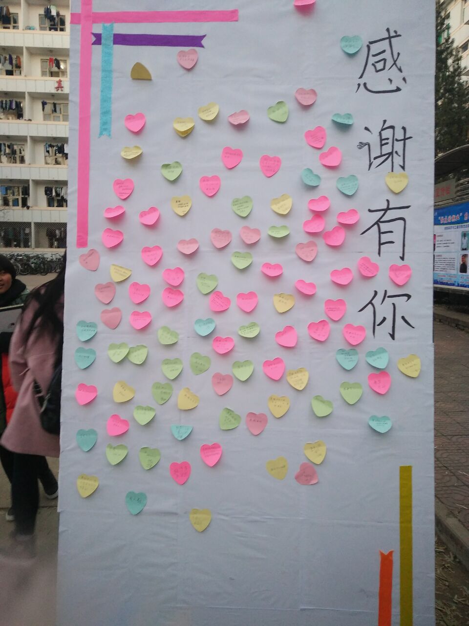 16030542团支部全体成员在文韬二号宿舍楼下,以感恩墙的方式展开本次感恩活动,意在让同学们懂得感恩,学会表达自己对他人的感谢。