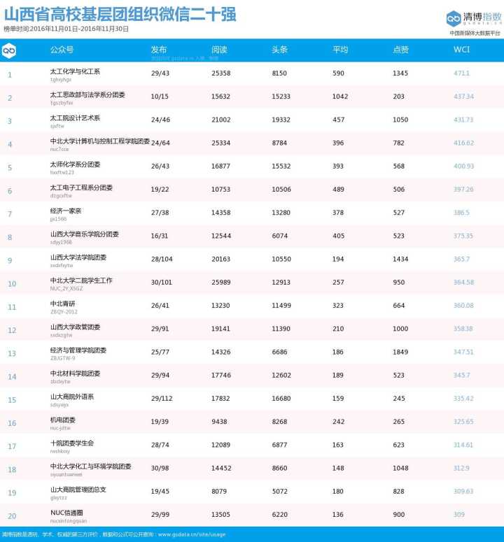 团委”进入2016年11月1日——2016年11月30日山西省高校基层团组织微信二十强。