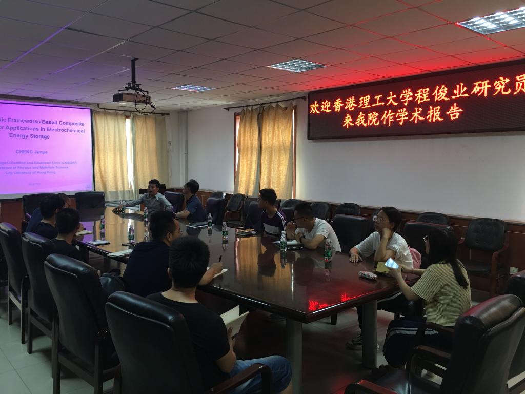 报告会上,程俊业博士以MOF材料在新能源领域应用入手,首先介绍了MOF及其纳米复合材料的发展现状,并结合自己的研究成果,重点介绍了二维Co-MOF/rGO、Ni-MOF/rGO膜状复合电极材料的制备及其在可编辑、非对称全固态超级电容器中的应用;其次程博士介绍了基于一维Ni-MOF纳米带交联还原氧化石墨烯网状复合电极材料的制备及其在锌离子混合储能器件中的应用。最后程俊业博士对自己近期的研究成果和香港几所大学博士、博士后申请现状和流程进行了介绍,引起在场师生的极大关注。