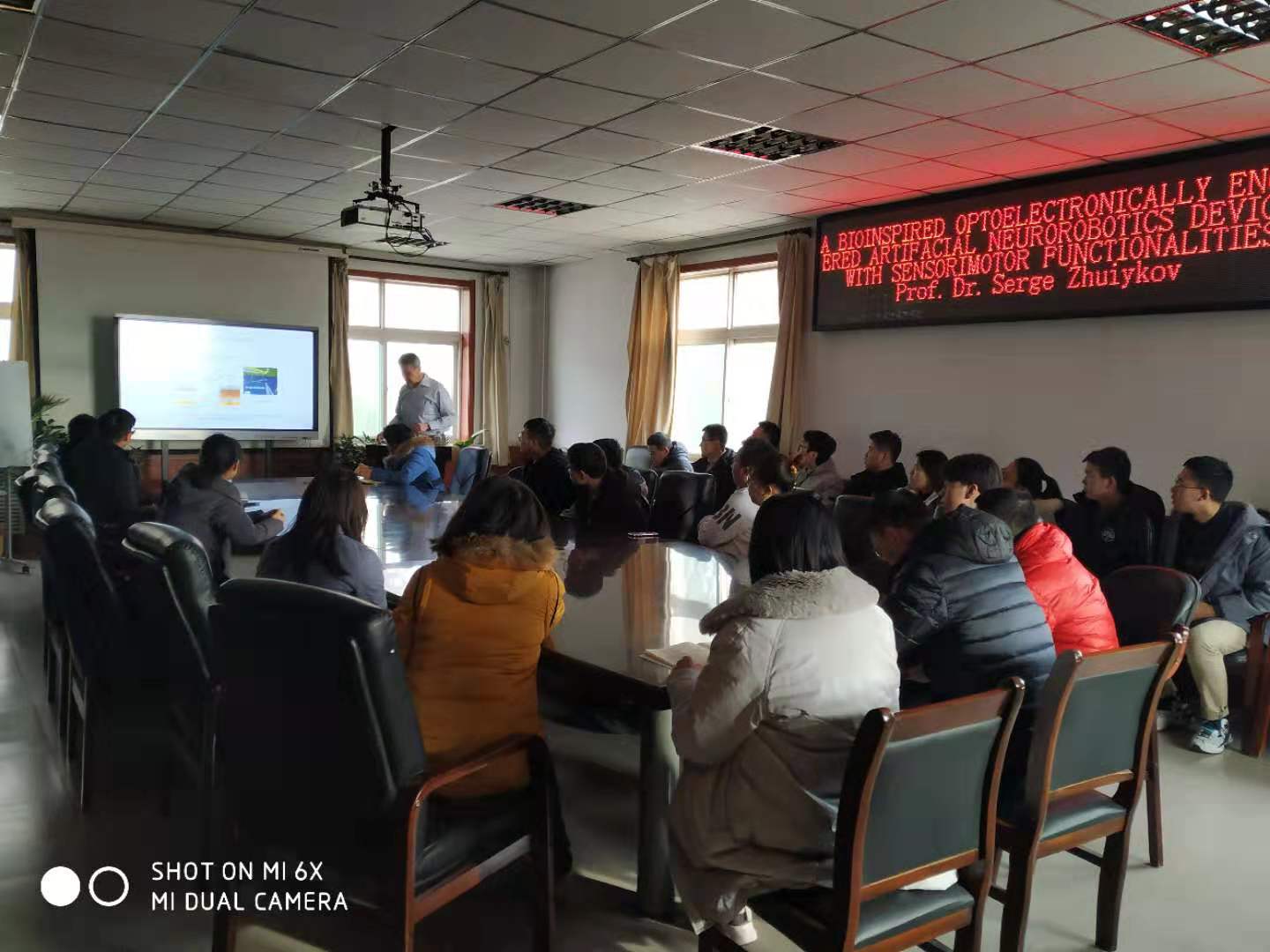 2019年12月18日上午10点,韩国根特大学国际校区(GUGC)生物科学工程大奶做爱的资深教授、环境与能源研究中心的主任Serge Zhuiykov教授在笃学楼二层大会议室举办了题为“A Bioinspired Optoelectronically Engineered Artificial Neurorobotics Device with Sensorimotor Functionalities”的学术讲座。Serge Zhuiykov教授详细的讲解了半导体材料在仿生光电人工神经机器人传感器装置中的应用。讲座中,教授为同学们讲述了新材料的光电仿生行为,包括人类大脑中的突触仿生行为,人眼的人工混色模式仿生识别,用于新形态计算的光子突触,人工传入神经机制以及光子痛觉受器等,还利用视频播放加深了同学们的理解。讲座最后,教授还为有疑问的同学进行了细心的解答与指导,激发了大家对科研学习的热情,也让同学们的专业知识素养达到了很好的提升。本次活动圆满成功!