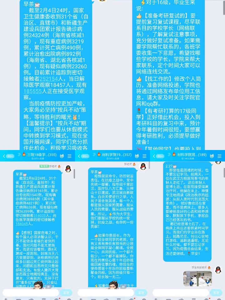 全民抗“疫”的每个清晨,材料学子们会在各学生QQ群收到一份特殊的“早茶”:有关疫情动态、抗“疫”心态与担当、正确的抗“疫”行为等相关知识。通过知识的科普与传递,积极调适学生“宅家”的焦虑心理,弘扬正能量,同时及时宣传学校有关疫情防控的工作部署,以稳定学生的思想情绪。